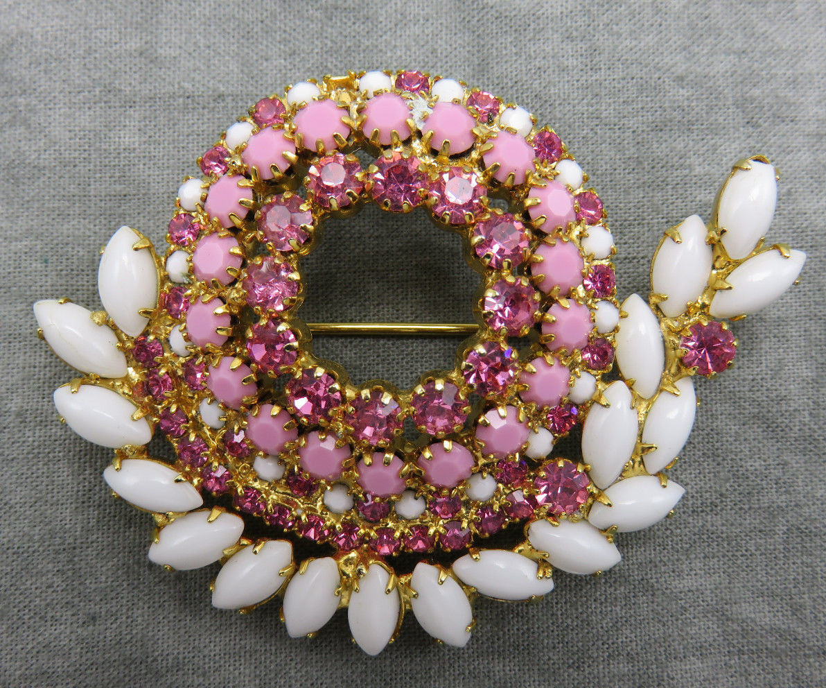 Title (ebay affiliate link): Weiss Vintage Brooch Pink Rose Rhinestone White Milk Glass Gold Jewelry 803f