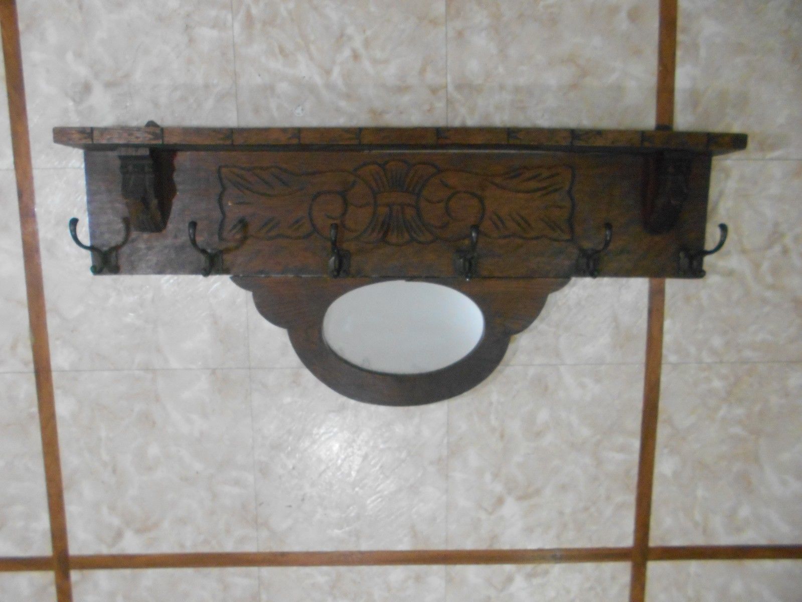 Title (ebay affiliate link): Antique Oak Mirrored Wall Mounted Hall Tree - 6 Hooks - Arts and Crafts