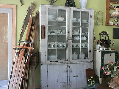 Primitive Antique Original White Chippy Paint Stepback Cupboard
