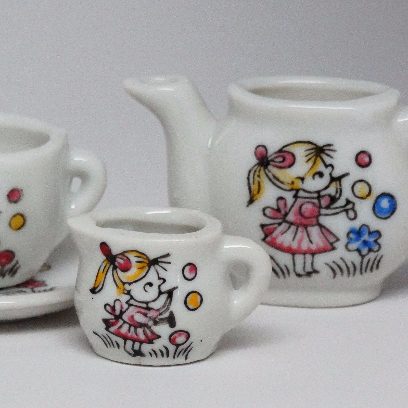 Title (ebay affiliate link): Vintage CHILD's China Tea Set MINIATURE TOY Girl Blowing Bubbles 7 PCS Japan VTG