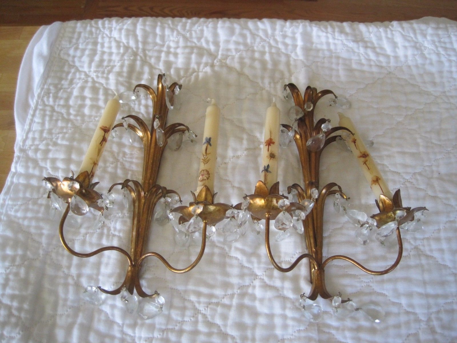 2 VintageTOLWARE WALL SCOUNCES GOLD GILT HANGING CANDELABRA CANDLE