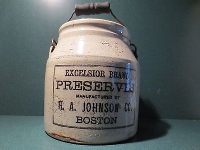 EARLY H.A. JOHNSON CO. BOSTON EXCELSIOR BRAND PRESERVES STONEWARE FOOD JAR/ CRO