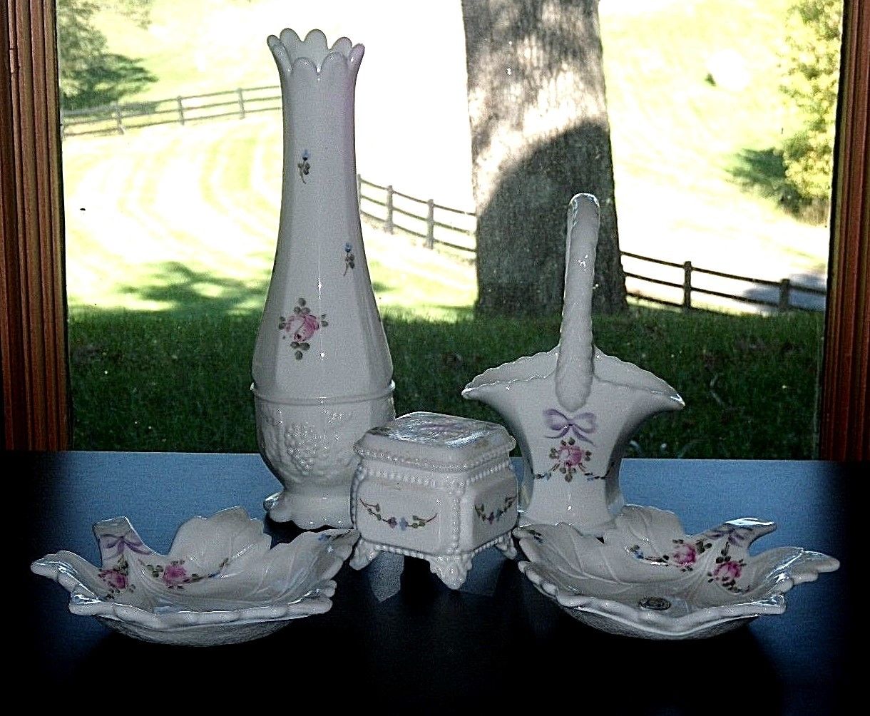 Westmoreland Milk Glass HP Charlton Roses 5pc Dresser Trays Vase Box Dresser Set