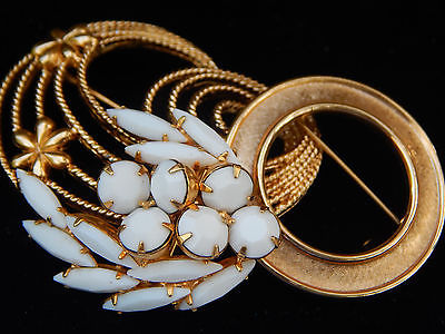 Vintage White Milk Glass Flower Gold Trifari & Monet Floral Brooch Pin Lot