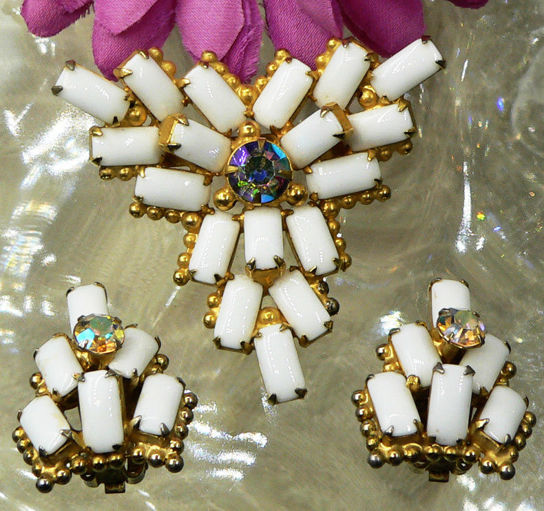 Title (ebay affiliate link): HIGH QUALITY VINTAGE MILK GLASS BAGUETTE AB RHINESTONE TRIANGLE PIN EARRINGS SET