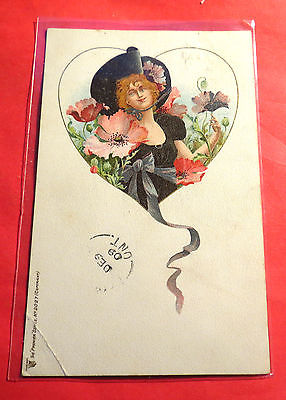 Woman in Heart Shaped floral display Div Back Vintage Postcard PC1382
