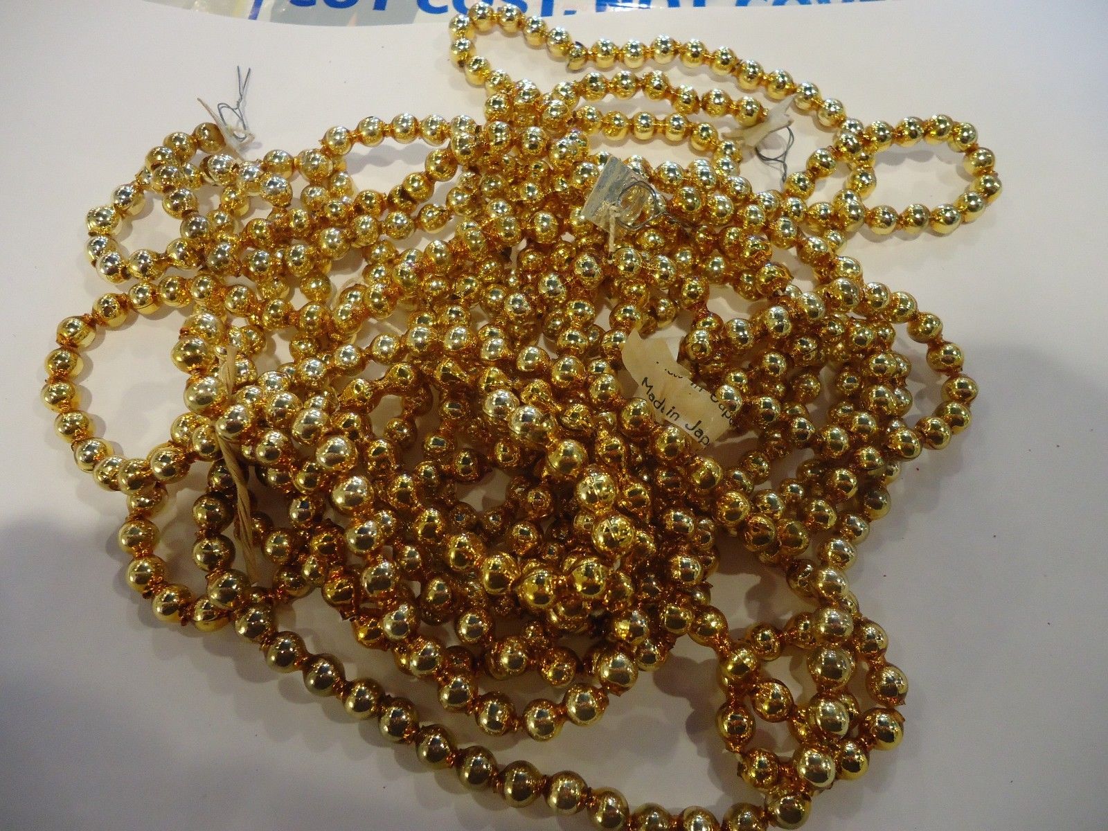Title (ebay affiliate link): 2 Vintage Christmas Mercury Glass Garland Strands Gold 5' & 9' W/Paper Label