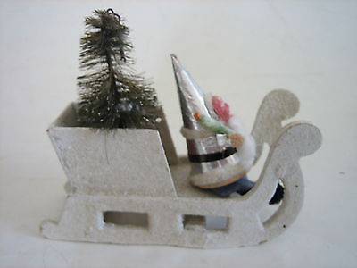VTG CLAY COMPOSION PAPER MACHE FACE SANTA IN MICA GLITTER SLEIGH SLED & TREE