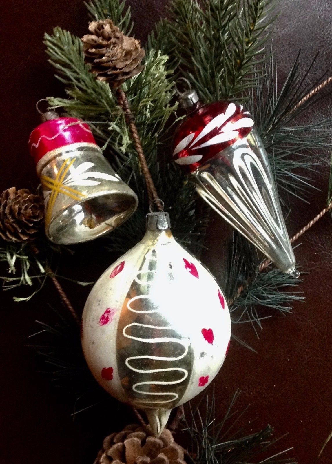 Title (ebay affiliate link): 3 VTG Painted Blown Mercury Glass Xmas Ornaments Germany-Teardrop/Bell/Parasol