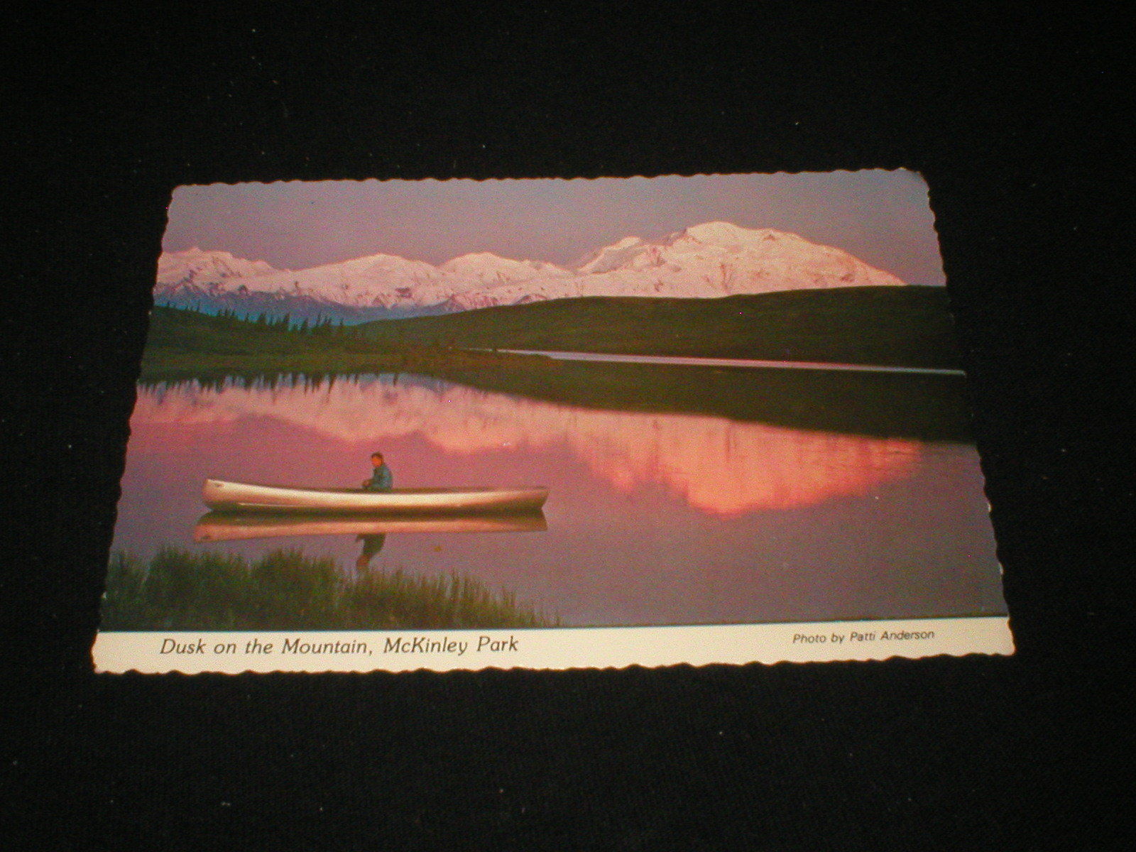Title (ebay affiliate link): McKINLEY PARK ALASKA ^^ Dusk On The Mountain & Man In Boat ^^ Postcard