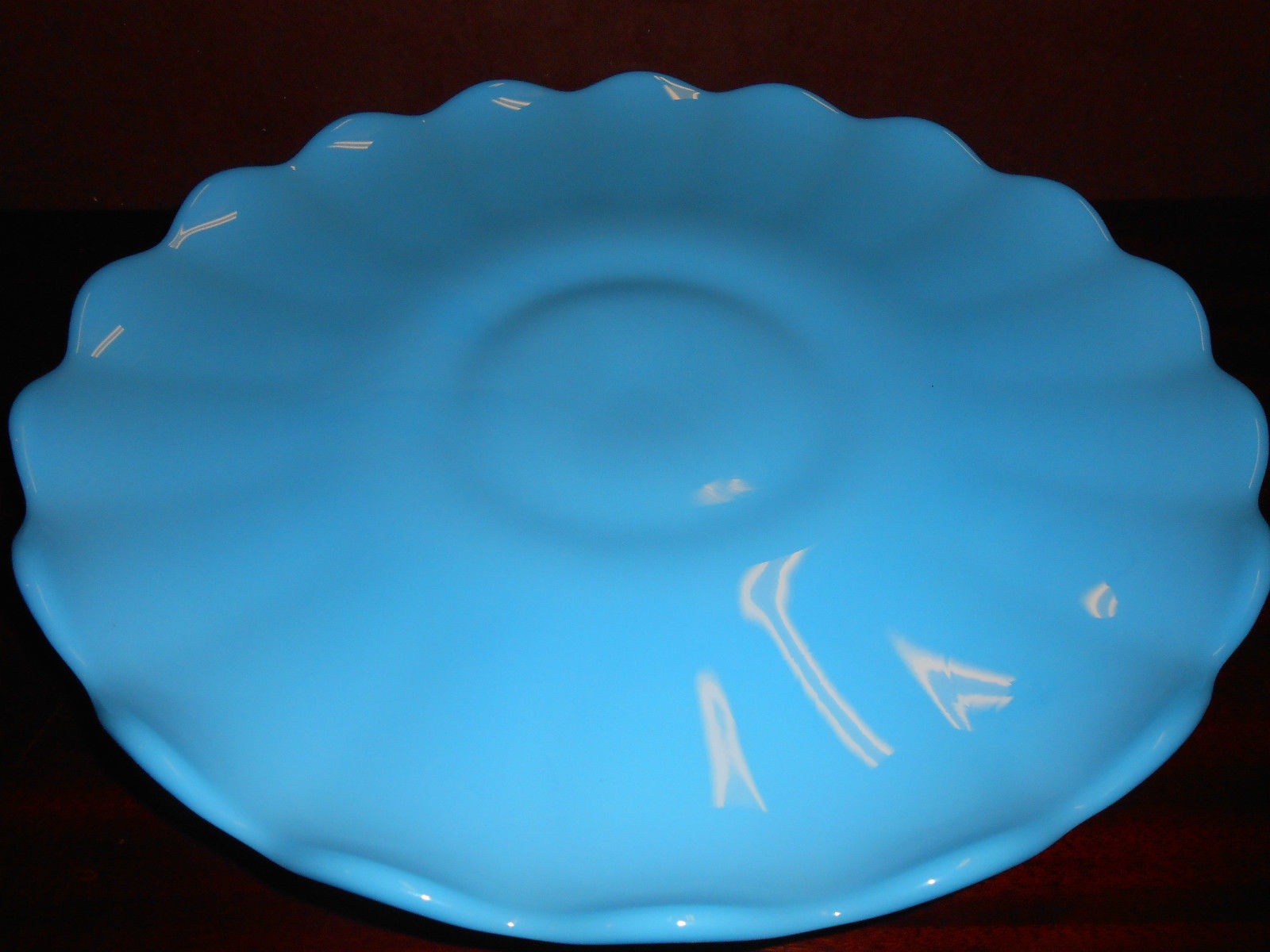 Title (ebay affiliate link): Blue milk Glass cake serving stand / plate platter pedestal raised tray cupcake