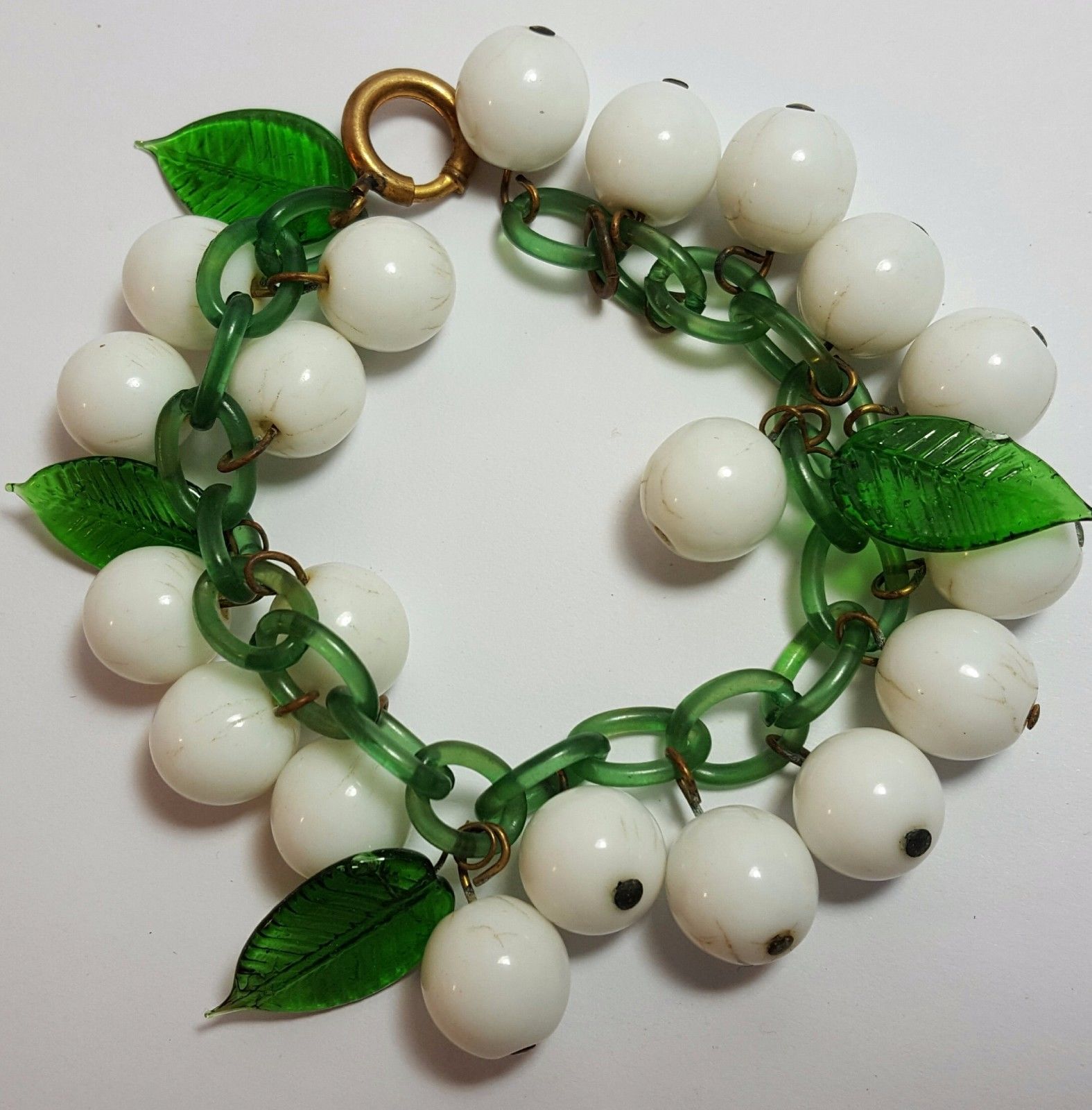 Title (ebay affiliate link): Green Celluloid Chain Bracelet W/Milk Glass Beads & Green Glass Leaves
