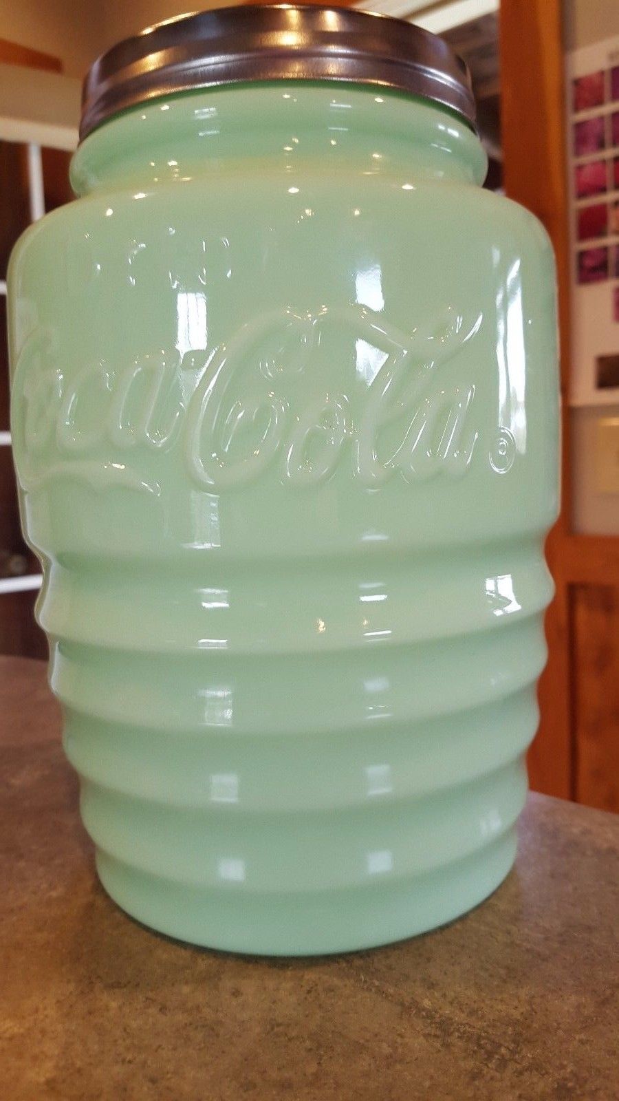 Title (ebay affiliate link): Coca Cola-Coke-Jadeite COOKIE JAR-Green Glass Canister & Chrome Lid