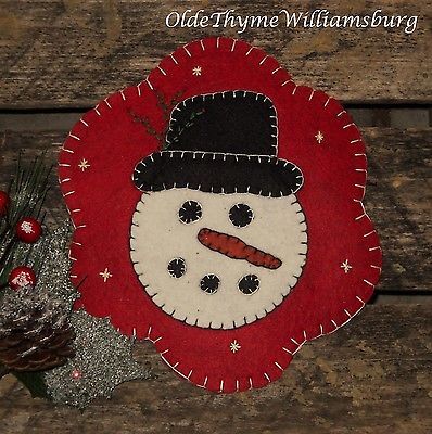 Title (ebay affiliate link): Primitive Winter SNOWMAN Wool Felt Penny Rug ~ Cranberry Christmas Candle Mat