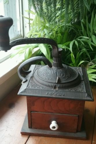 Title (ebay affiliate link): Antique coffee Grinder Dovetailed drawer and body ornate iron handle