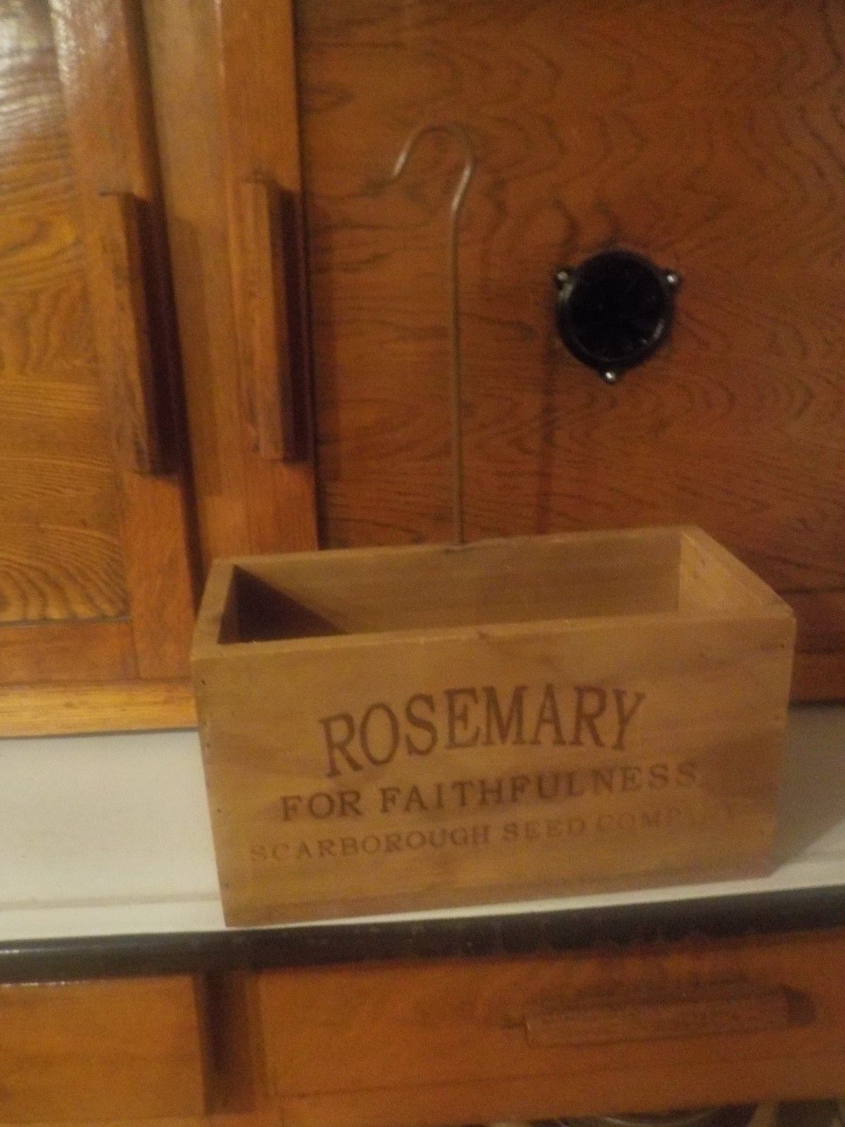 VINTAGE WOOD ROSEMARY HANGING BOX W/ METAL SHEPARDS HOOK-SPICE BOX