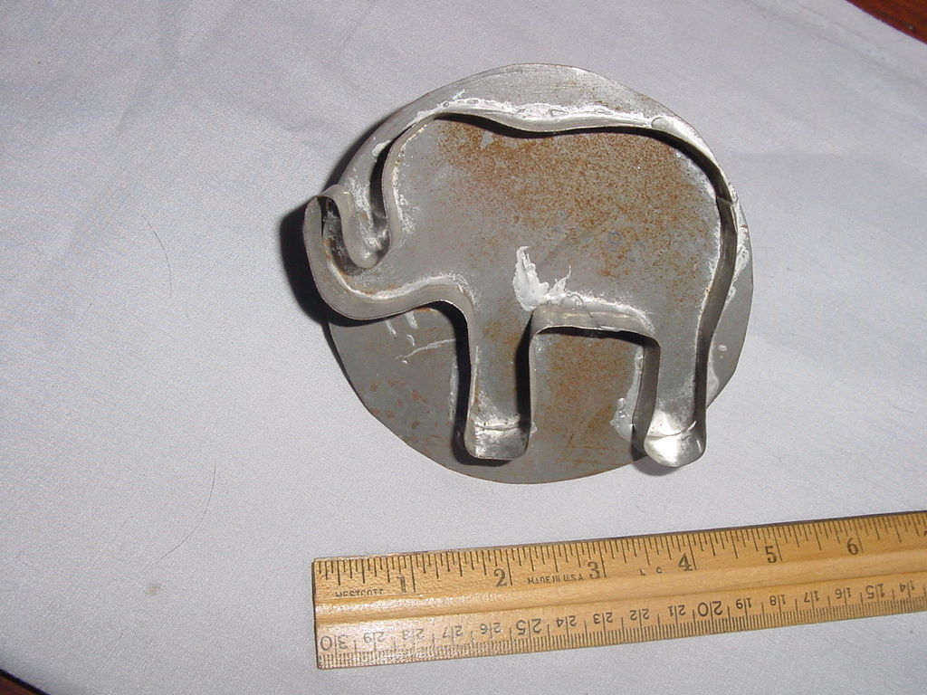 Title (ebay affiliate link): ANTIQUE PRIMITIVE TIN FLAT BACK COOKIE CUTTER SOLDERED ELEPHANT STRAP HANDLE