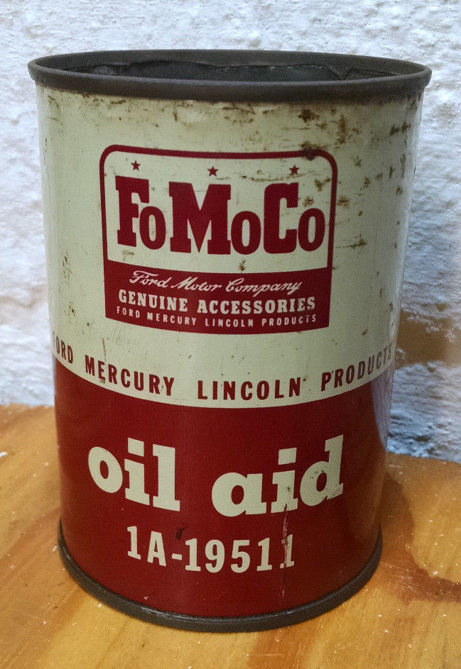 Title (ebay affiliate link): Vintage FoMoCo Oil Aid Metal Tin Can 15 oz Ford Lincoln Mercury gas sign dealer