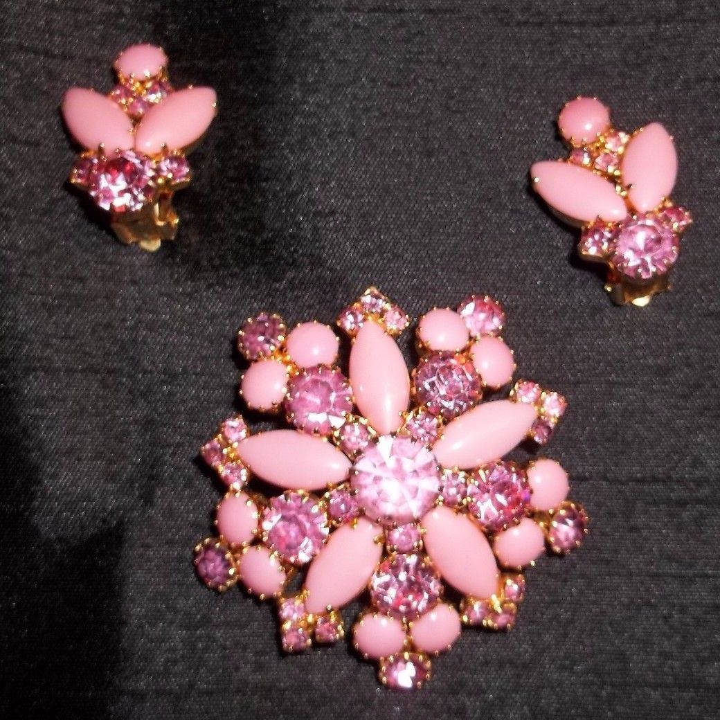 Title (ebay affiliate link): Vintage Brooch + Clip Earrings Demi Set Pink Milk Glass & Rhinestones STUNNING!