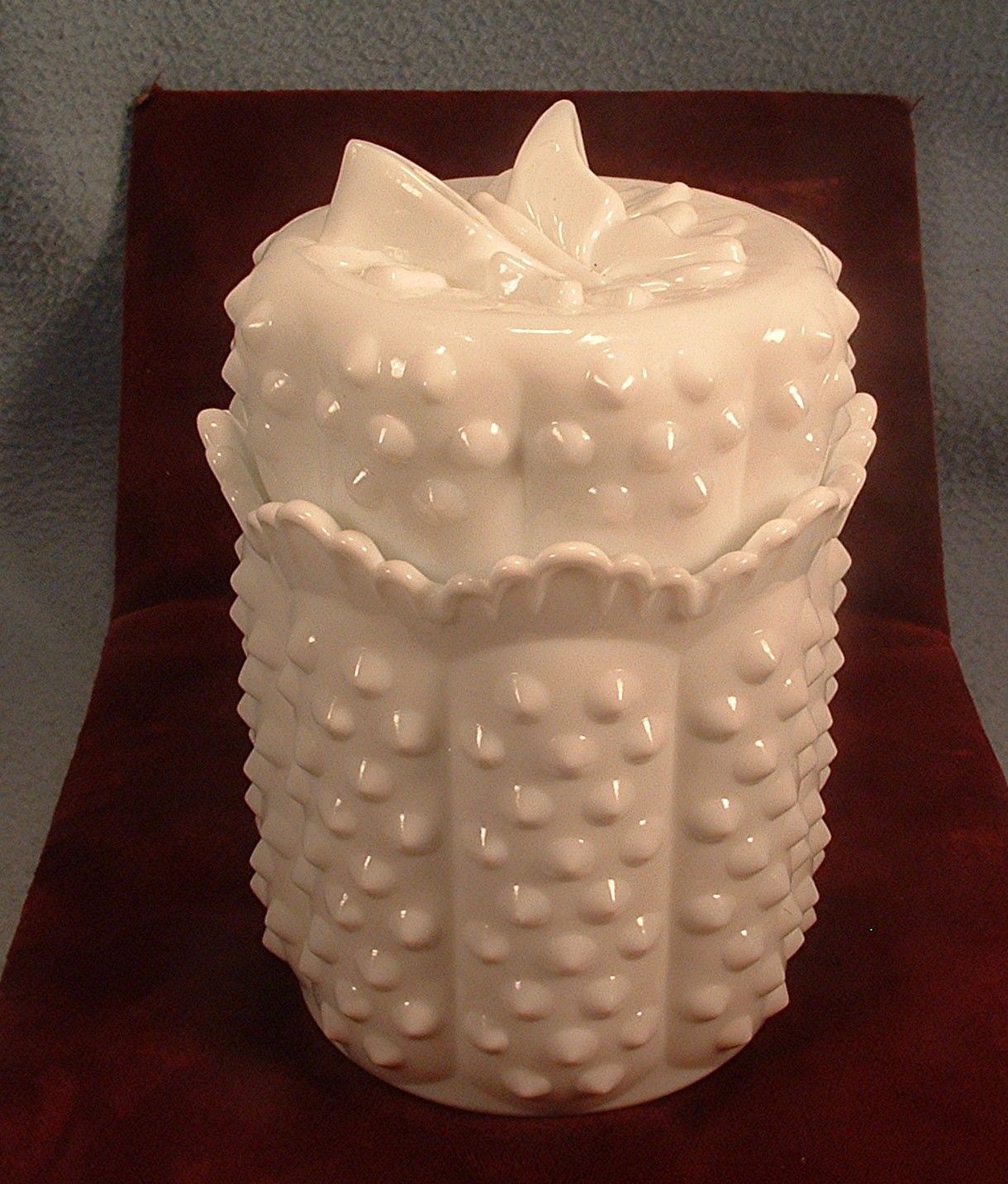 Title (ebay affiliate link): Vintage Fenton White Milk Glass Hobnail Pattern Embossed Butterfly Candy Jar