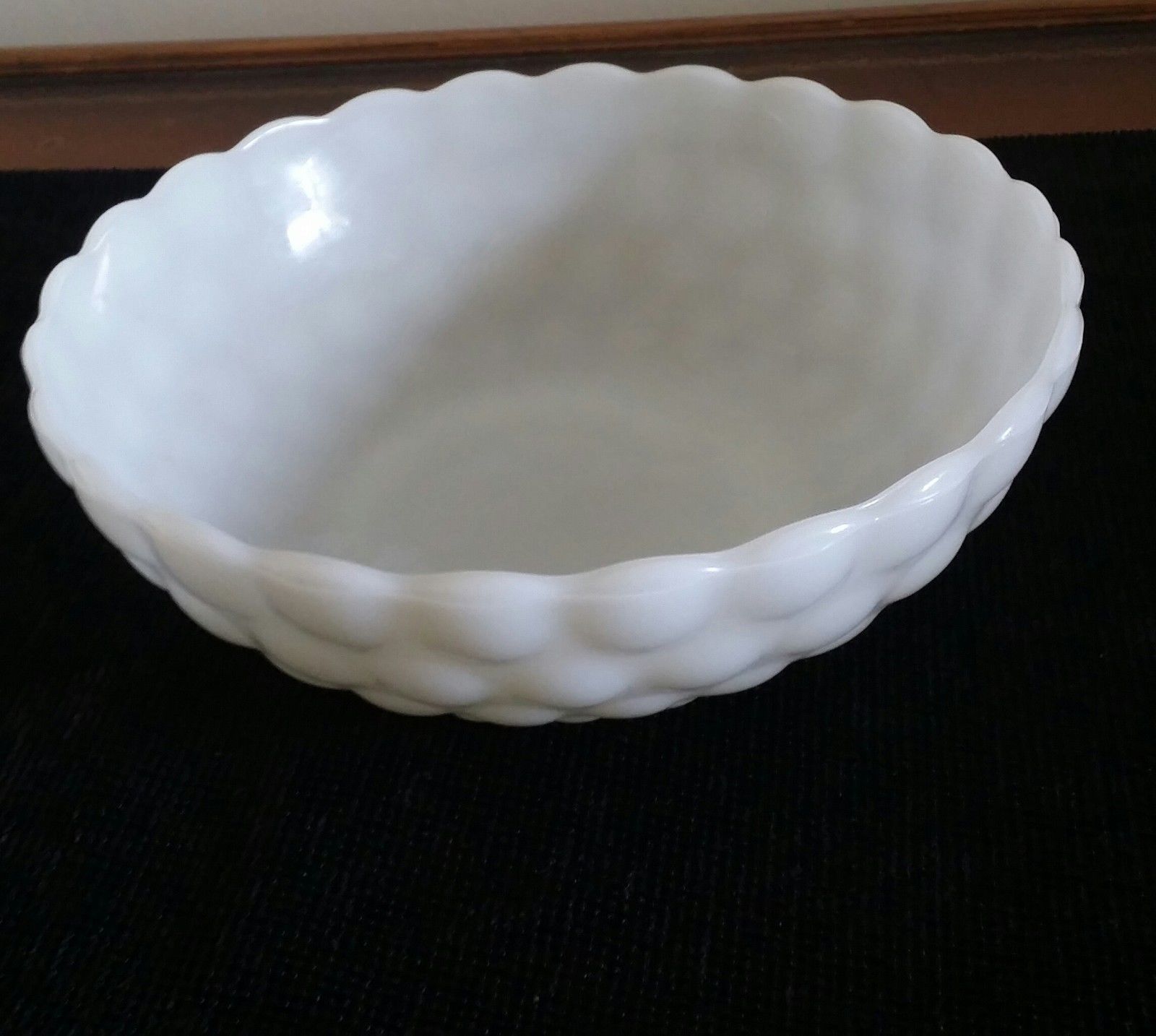 Title (ebay affiliate link): MID CENTURY MILK GLASS SERVING BOWL WITH UNIQUE, RARE BUBBLE DESIGN EXCELLENT