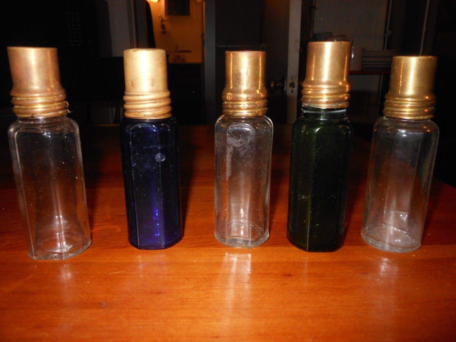 Title (ebay affiliate link): 5 glass stopper and brass capped pharmaceutical bottles