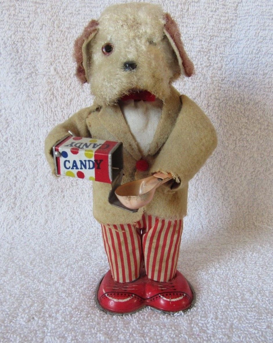 Vintage Wind Up Tin Toy Dog Eating Candy