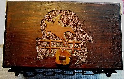 Antique Folk Art Primitive Wood Box Chest Trunk HINGE Lid WOOD CHAIN WESTERN