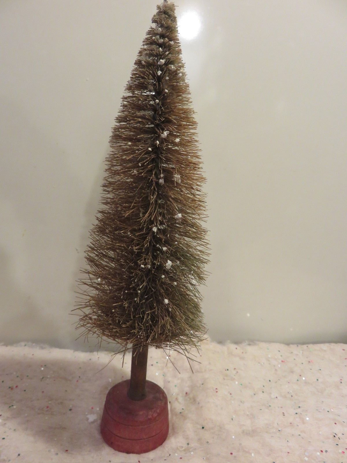 Title (ebay affiliate link): RETRO SHABBY ANTIQUE CHRISTMAS BOTTLE BRUSH TREE WHITE FLOCKING RED WOOD BASE