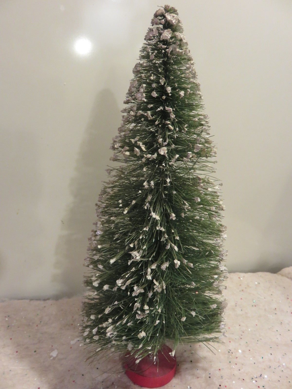 Title (ebay affiliate link): RETRO SHABBY ANTIQUE CHRISTMAS 12" BOTTLE BRUSH TREE WHITE FLOCKING WOOD BASE