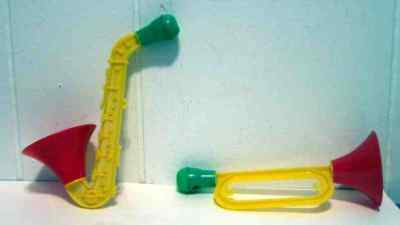 2 OLD PLASTIC TOY NOISEMAKER HORNS - TRUMPET & SAX USA