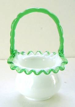 Title (ebay affiliate link): Milkglass White Basket With Green Handle & Crimped Rim