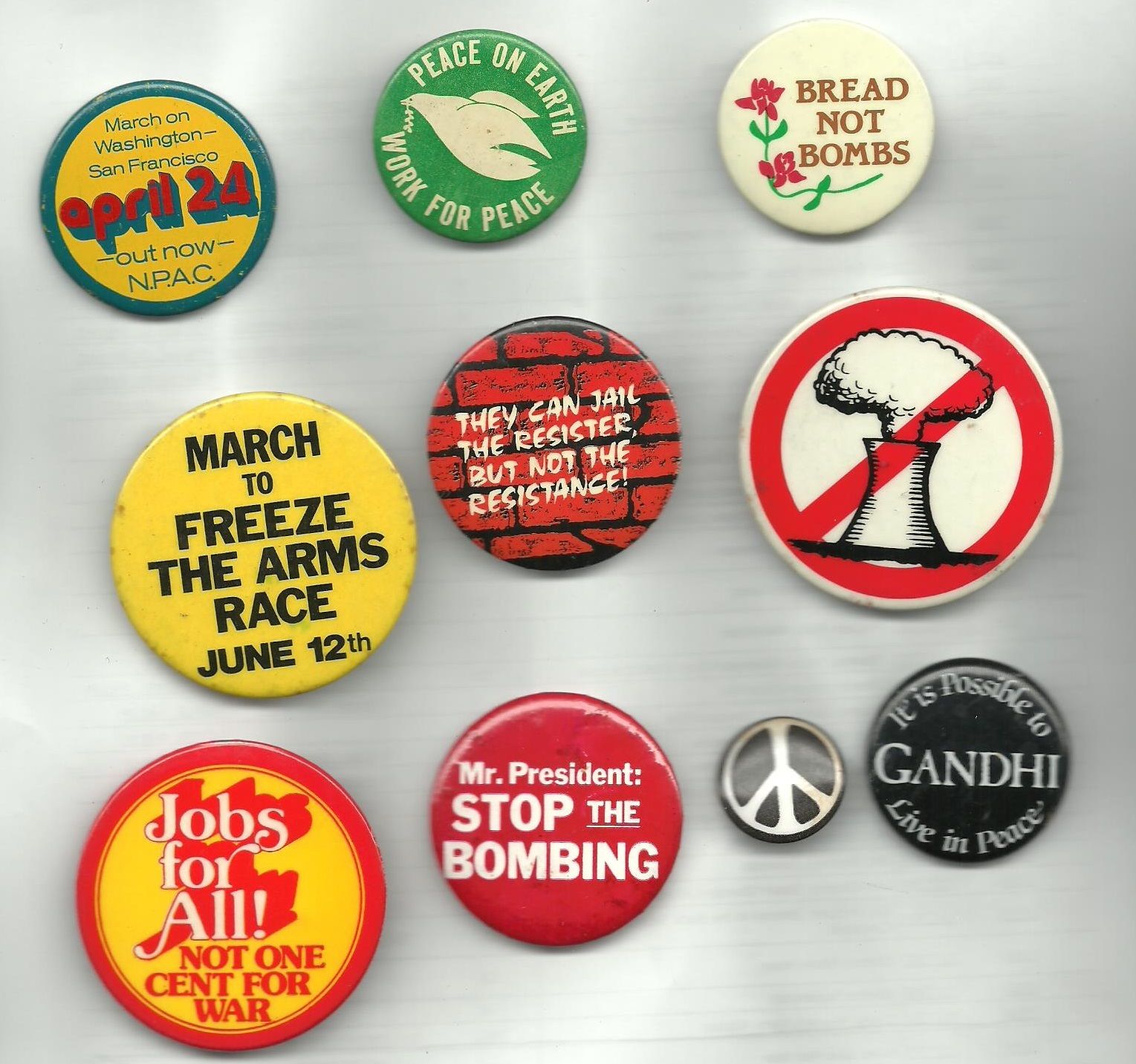 Title (ebay affiliate link): COLLECTION OF 10 PEACE, ANTI WAR POLITICAL PINS, VIETNAM, NUCLEAR, GANDHI