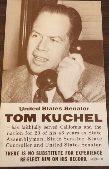 Title (ebay affiliate link): Re-Elect Tom Kuchel for U.S. Senator California Political Campaign Postcard