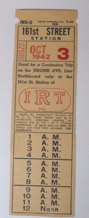 Title (ebay affiliate link): 1942 NYCTA IND DIV. TRAIN TRANSFER TO IRT 161 ST JEROME AVE # 4 SUBWAY BRONX