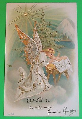 1902 Christmas Angel Whispers to Baby Jesus-Original Antique VTG French Postcard