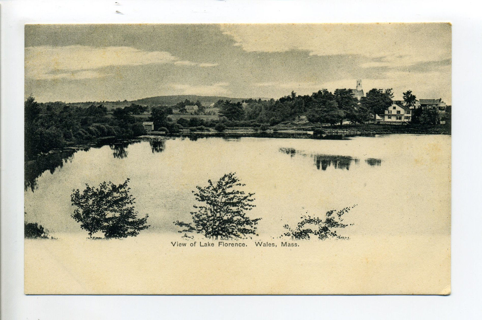 Title (ebay affiliate link): Wales MA Mass View of Lake Florence, church, homes in distance, early