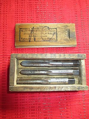 Antique S.W. Card MFG Co. Wood Box W/ 3 Tap Die Screw Plates Bits 5/16 - 18 NC