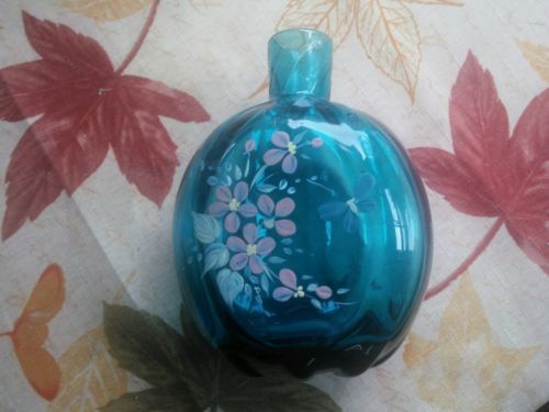 Victorian Glass Teal Blue Enameled Posy Vase Butterfly and Flowers