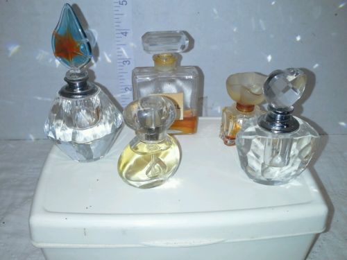 Title (ebay affiliate link): 5 ANTIQUE CRYSTAL CUT GLASS PERFUME BOTTLES CLEAR & PEACH COLOR DETAILED SALE NR