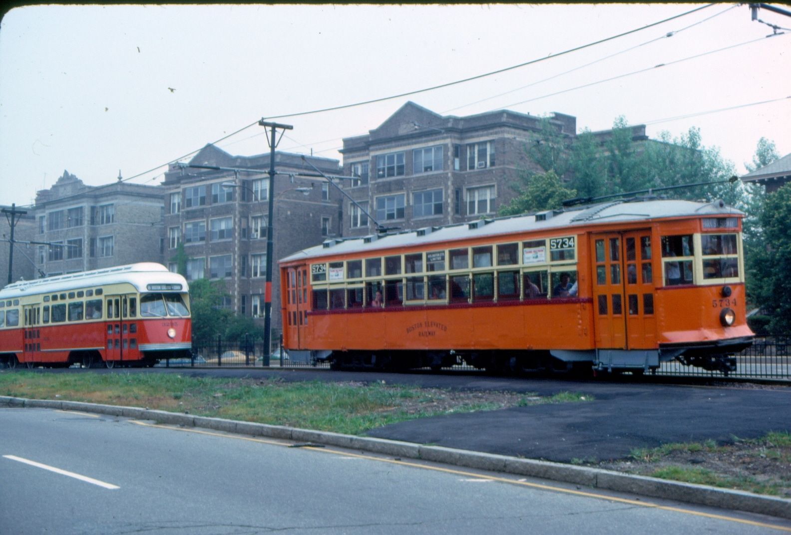 35mm Orig Slide MBTA Trolley #5734 & PCC #3295 Mt Hood Road & Commonwealth Ave