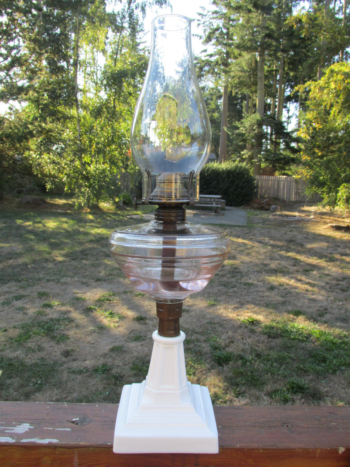 VINTAGE ANTIQUE SCOVILL QUEEN ANNE MILK GLASS GLASS HURRICANE OIL LAMP wth WICK