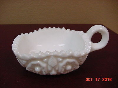 SMALL WHITE MILK GLASS BERRY BOWL, CANDY DISH WITH HANDLE