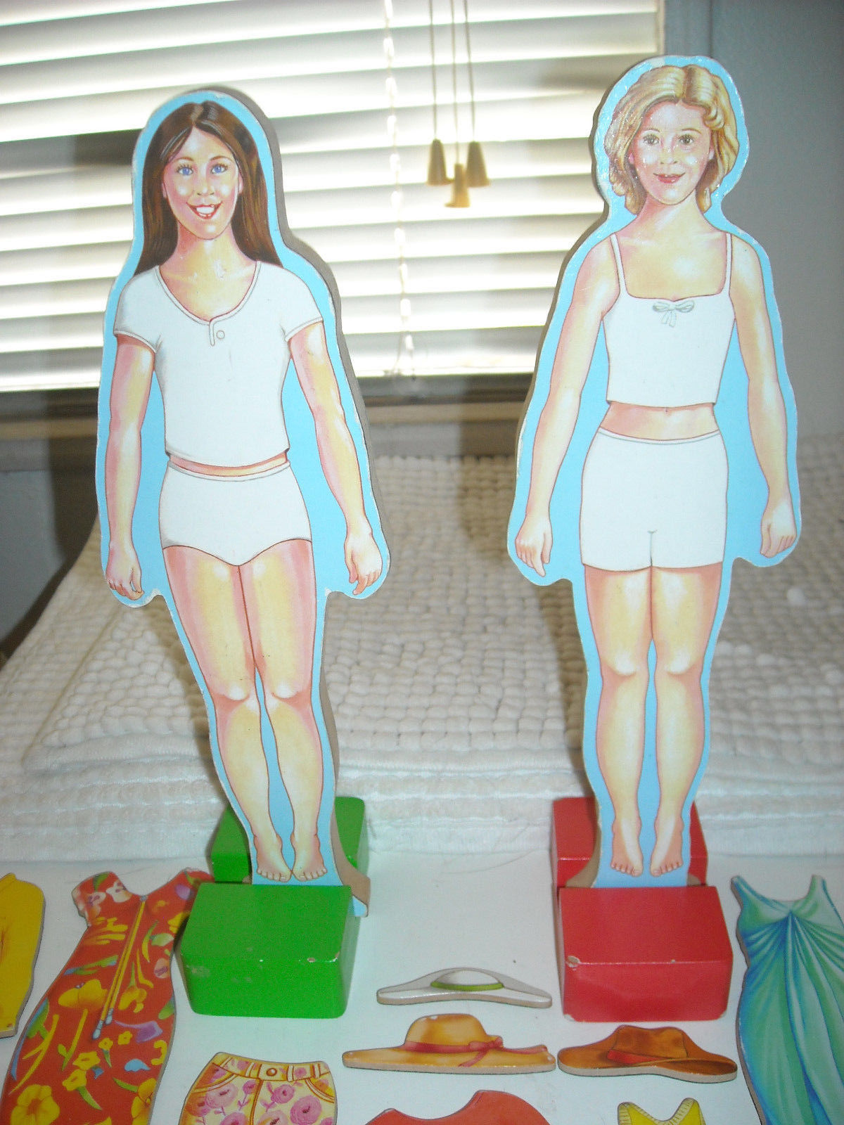 Title (ebay affiliate link): Set of 2 Vintage Magnetic 10" Paper Dolls-32 Pc Wardrobe-Wooden Backed w/Stands