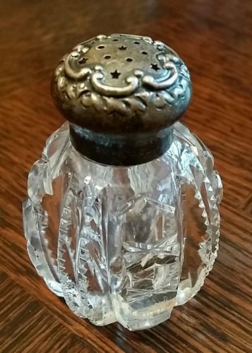Title (ebay affiliate link): Vintage Shaker Bottle Crystal or Cut Glass Sterling Silver Top BEAUTY!
