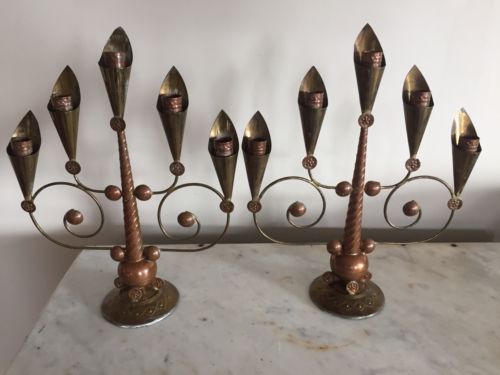 Unique Pair Antique Copper & Brass Candelabra Candlesticks