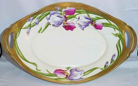 Title (ebay affiliate link): Antique Art Nouveau Bavaria Oval Handled Serving Bowl HP Irises Signed Favre N/R