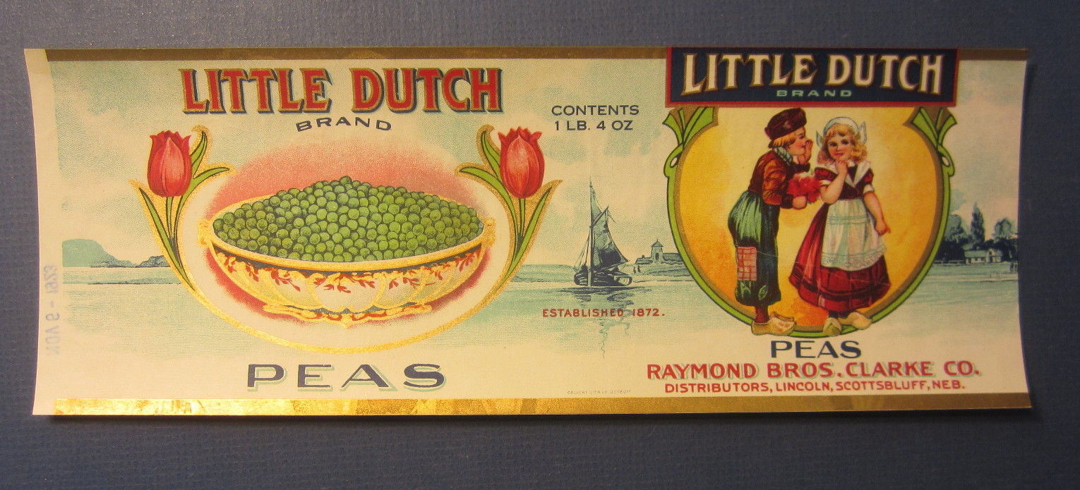 Title (ebay affiliate link): Old Vintage 1923 LITTLE DUTCH Peas CAN LABEL - Lincoln Scottsbluff NE - CALVERT