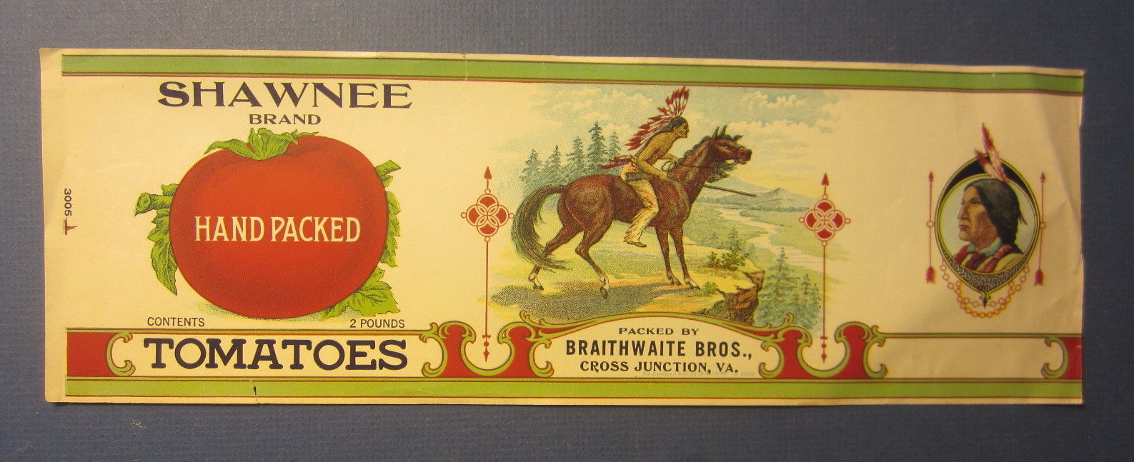 Old Vintage c.1910's SHAWNEE Tomatoes CAN LABEL Indian - Cross Junction Virginia
