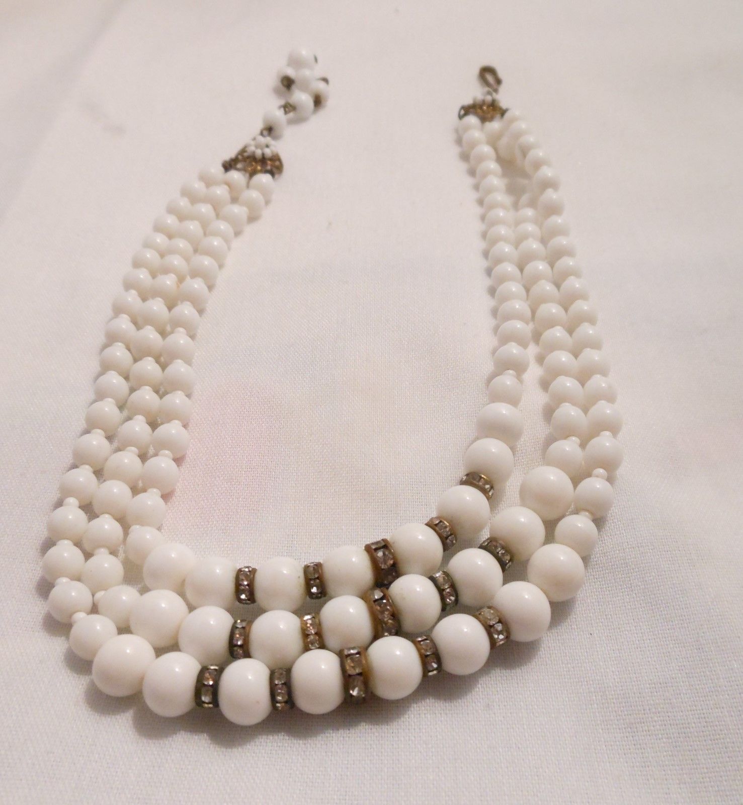 Title (ebay affiliate link): Vtg. 3 Strand Milk Glass Bead & Rhinestone Rondelle Necklace Hand Knotted